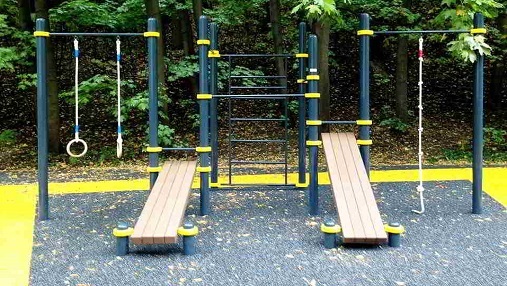 После нанесения резинового покрытия осуществляем благоустройство и установку спортивного инвентаря